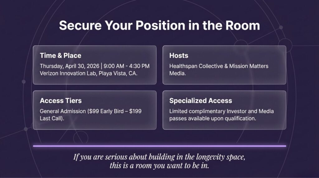 On April 30, 2026, in Playa Vista, CA the 3rd Annual Longevity Leadership Conference is set to bring together influential decision-makers in the healthspan industry for the latest evidence-based opportunities in the field of longevity. Hosted by the Healthspan Collective and Mission Matters Media at the Verizon Innovation Lab, this event eschews the traditional, crowded expo format in favor of a curated mastermind. The founders claim this is where the future of medicine is being written and is a space designed for clinicians, founders, and investors to engage in high-signal conversations about where science is heading and where capital is flowing.