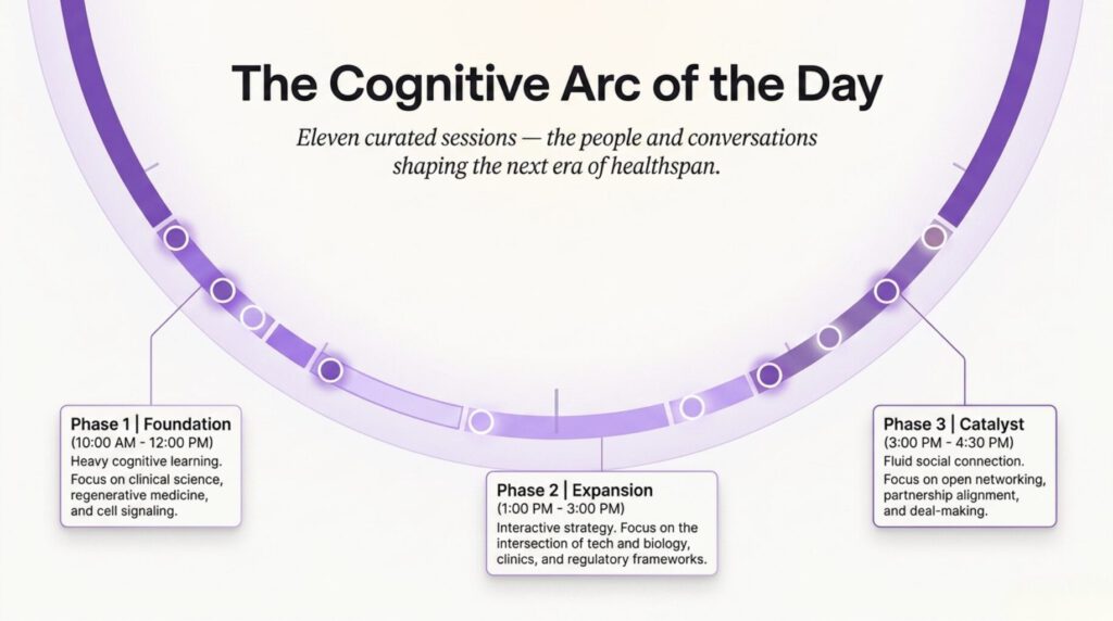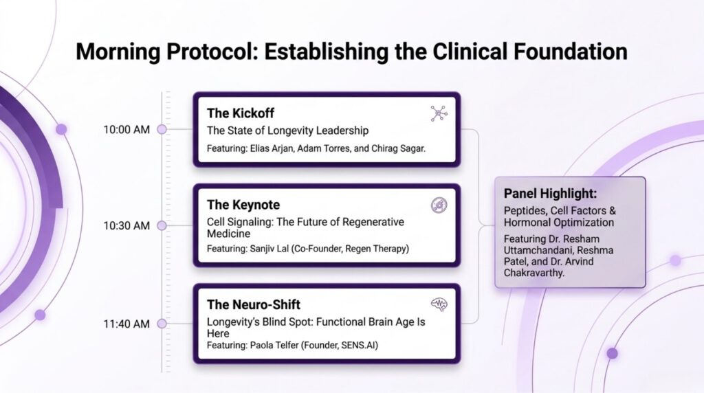 The first half of this intensive one-day event is entirely dedicated to strategic foresight and clinical applications. Kicking off at 10:00 AM, the event opens with “The State of Longevity Leadership” led by Elias Arjan, Adam Torres, and Chirag Sagar.