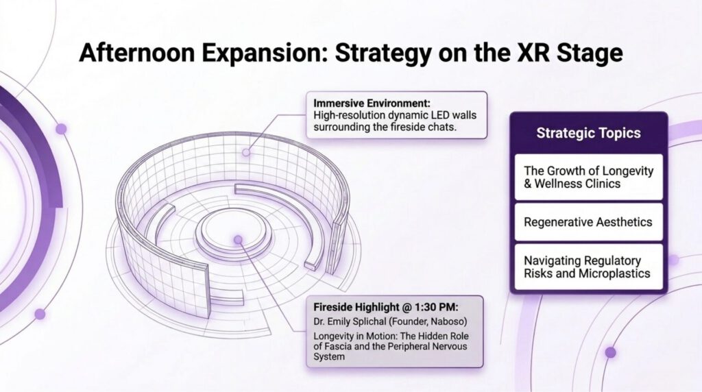 As the day progresses into the afternoon (1:00 PM – 3:00 PM), the focus shifts toward strategy, capital, and the intersection of technology and biology. Set against the backdrop of Verizon’s XR Stage—which surrounds speakers with dynamic, high-resolution LED walls—the afternoon features cutting-edge fireside chats. Attendees will explore “Regenerative Aesthetics,” the hidden role of fascia in mobility, and “The Growth of Longevity & Wellness Clinics”. The afternoon sessions round out with critical discussions on microplastics and the regulatory risks facing the longevity industry today.