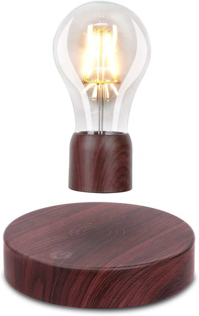Magnetic levitation creates a floating light source that rotates continuously, providing ambient illumination with visual interest. Wireless charging base supports multiple devices while the lamp operates. Gesture controls adjust brightness without physical contact.