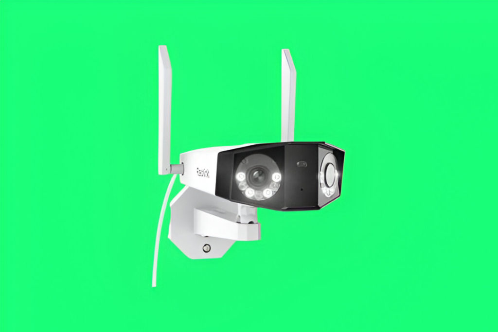 For under one hundred dollars, this dual lens camera delivers features that usually require multiple units. The paired lenses create a seamless one hundred eighty degree panoramic view in 4 K quality with person, vehicle, and pet detection plus color night vision through built-in spotlights. It supports both two-point four and five gigahertz WiFi. Two-way audio, a motion-activated siren, and free remote access through the Reolink app provide complete security without monthly fees. It records locally to a microSD card up to five hundred twelve gigabytes, a Reolink NVR, or a NAS. The IP66 rating makes it suitable for year-round outdoor use.