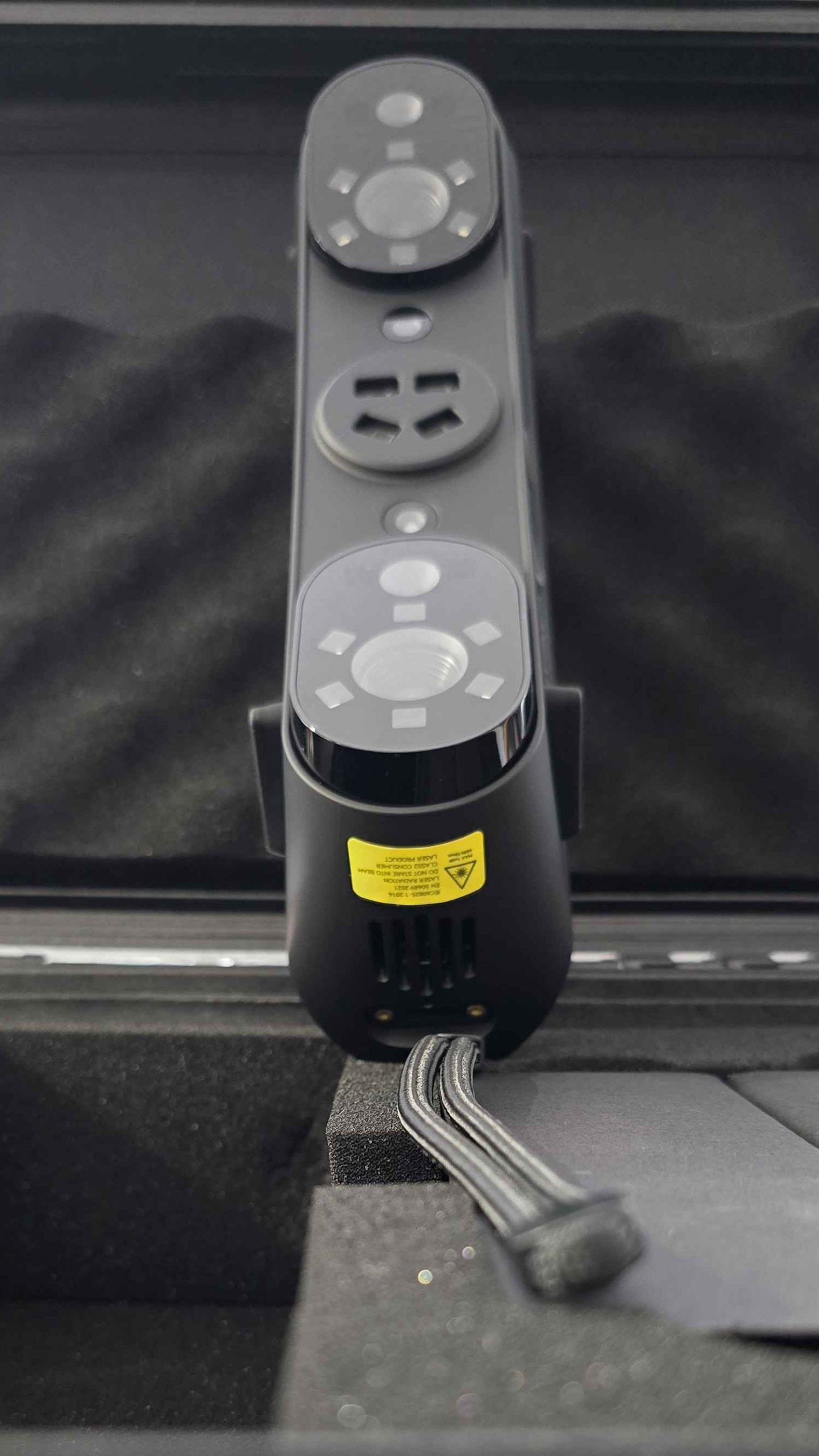 The triple-light system (34 white lights + 7 blue lasers + NIR) enables scanning of challenging surfaces, including black, shiny, and metallic objects without powder coating requirements.