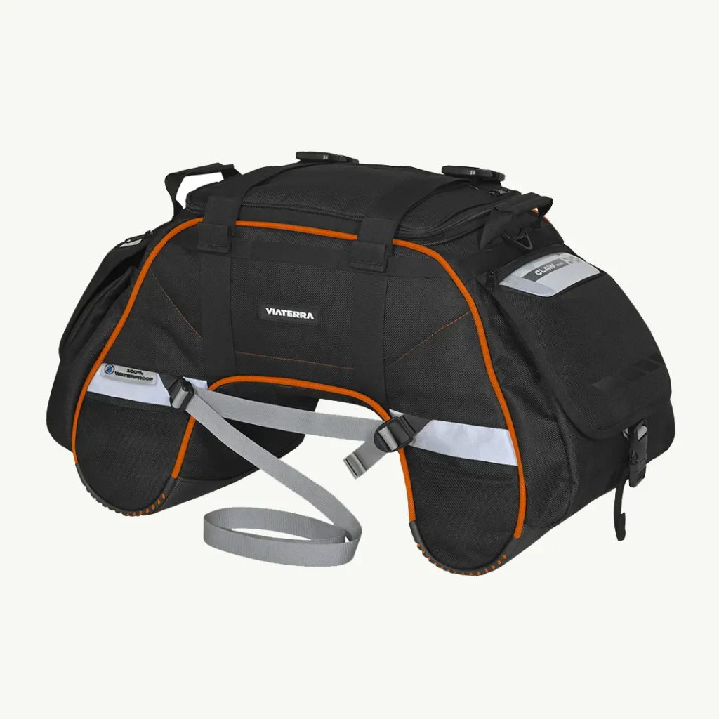 Waterproof tail bag with roll-top closure and multiple compartments mounts securely using straps without requiring special racks.