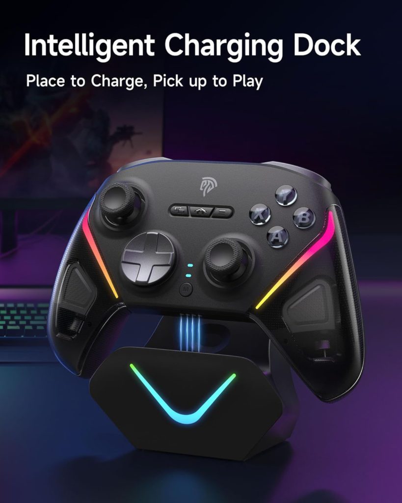 RGB accent lighting adds visual flair while tactile Hall Effect triggers adapt between racing and shooting game profiles seamlessly. The integrated magnetic charging dock keeps power topped off, and distinct configuration profiles make switching between game types effortless. Under $60 puts premium responsiveness within reach.