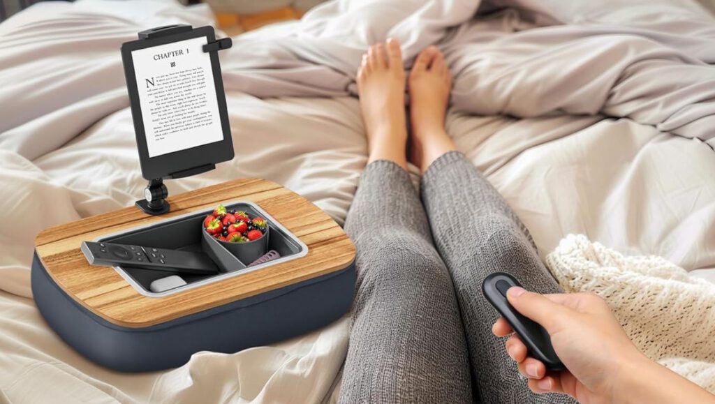 The removable silicone snack bowl is straight-up genius. Because who hasn’t balanced popcorn precariously on their chest like some kind of human shelf? With dual adjustable joints, this setup creates a cozy entertainment station that works on couches, beds, and recliners.