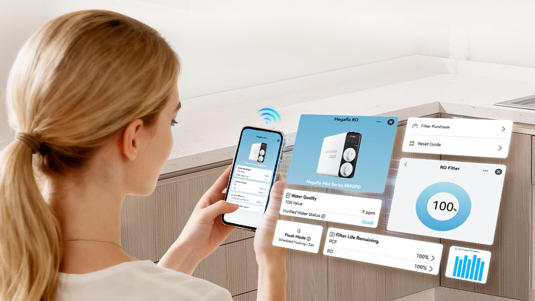 Where the Megaflo Mini begins to stand apart is in how it integrates into daily routines. The system connects to home WiFi and provides real-time data through the MIZUDO app, including remaining filter life, TDS levels, flush timing, and overall water usage.
