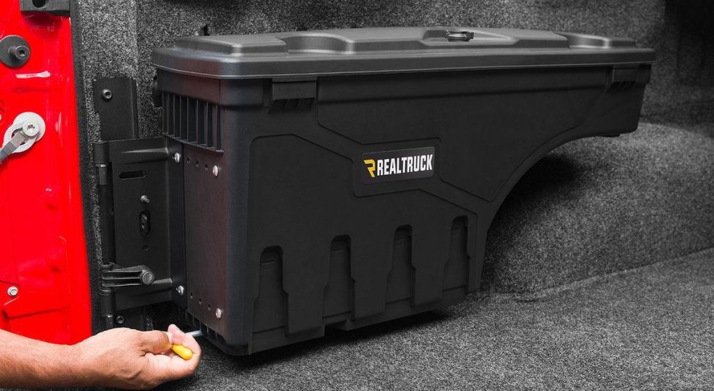 The lockable design protects tools and equipment from weather and theft, while the swing-out mechanism provides ground-level access without removing the case. Multiple size options accommodate different tailgate configurations and storage needs.