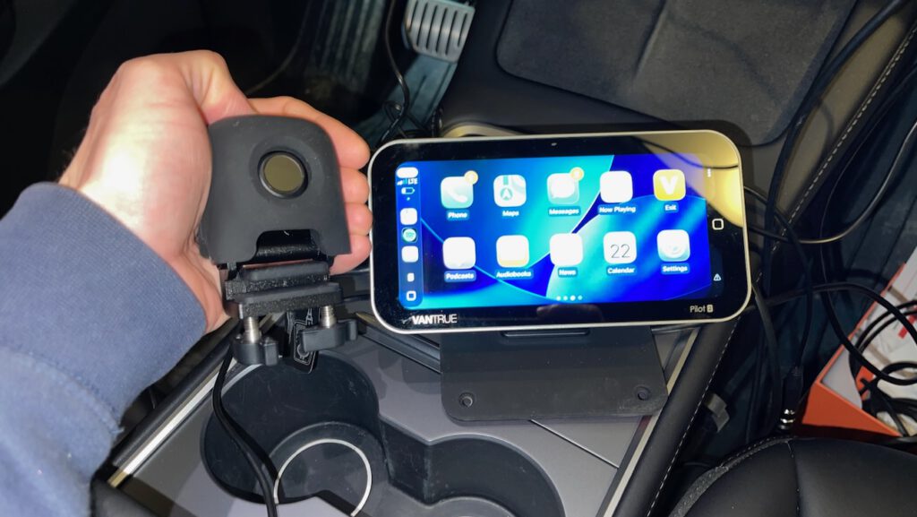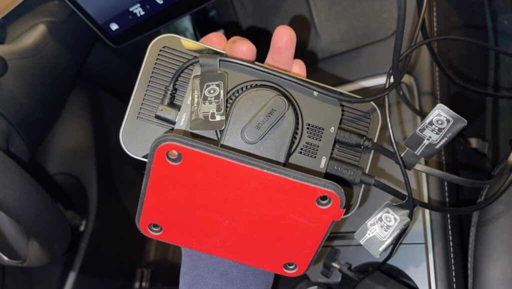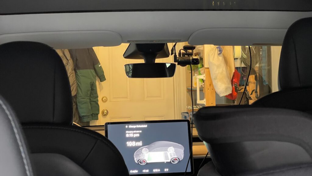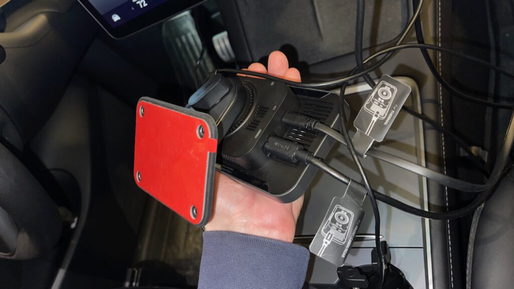 I tested the Pilot 2 on a 2022 Tesla Model Y, which already has built-in cameras, so this was an evaluation of the system rather than a primary install. The front-and-cabin camera and rear camera setup was straightforward — roughly 25 minutes to get both positioned and connected. The center console 12V outlet handles power without issue.