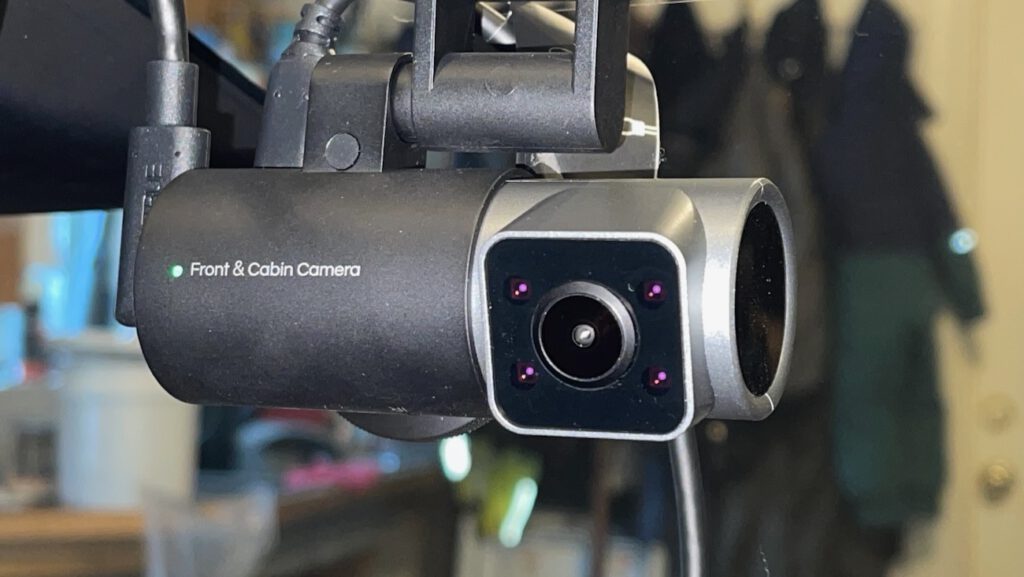 The front camera uses a Sony IMX675 sensor at 5 megapixels with a 158-degree field of view and an F1.8 aperture. The wide aperture matters in low light — more light hits the sensor, which means less noise and better detail in dark conditions. The cabin camera is a Sony IMX662 at 2 megapixels with four infrared lights built in for night recording and a 165-degree field of view. The rear camera covers 160 degrees at 1440p.