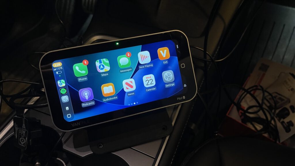 CarPlay connects wirelessly and works well. The connection process uses Bluetooth for the initial handshake — the devices authenticate and exchange Wi-Fi credentials — then immediately switches to the Pilot 2’s own Wi-Fi 6 network for everything you see and hear. Once that handshake is done, your phone’s Bluetooth is free. That means you can keep your phone paired to your car’s audio system via Bluetooth while CarPlay runs independently over the Pilot 2’s Wi-Fi network. Both connections coexist. In practice this means music plays through your car’s speakers as normal, navigation and app control run through the Pilot 2 display, and nothing needs to be rerouted or reconfigured each time you get in. It is a clean setup once the initial pairing is done.
